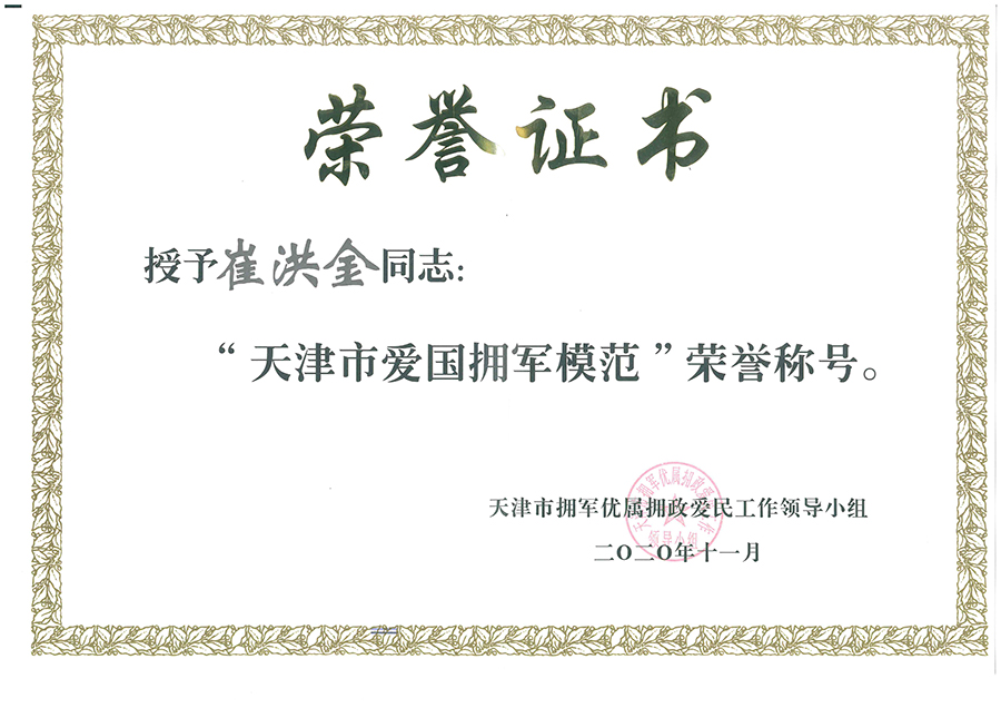 荣耀体育(中国)集团党委书记、董事长崔洪金当选“天津市爱国拥军模范”