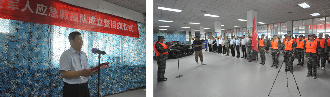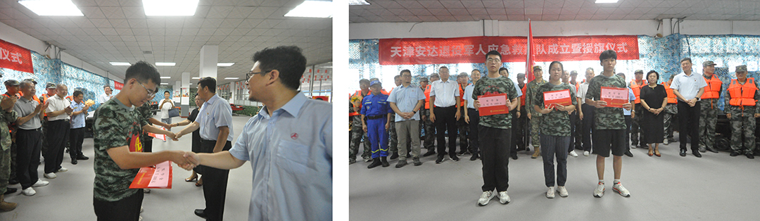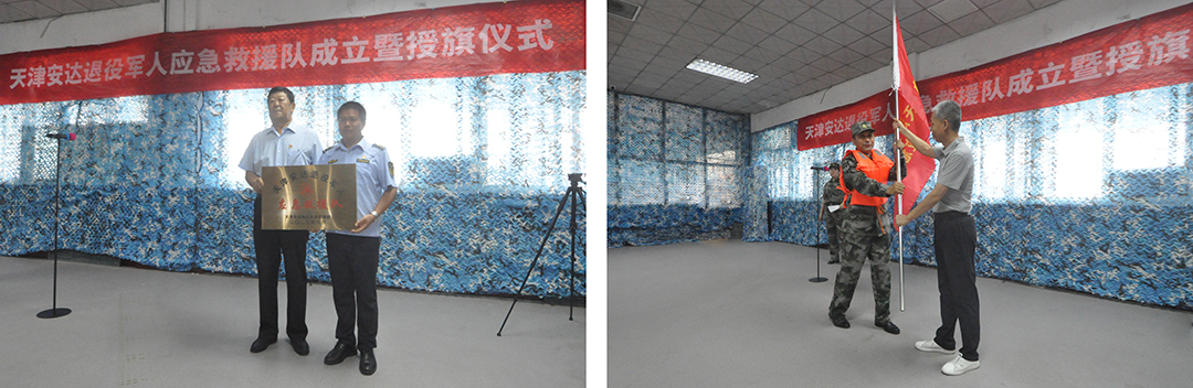 在全体人员的共同见证下,区退役军人事务局局长曹砚海,区应急管理局党委委员俞先军分别向荣耀体育(中国)集团董事长崔洪金、应急救援队队长张恩欣授牌和授旗。