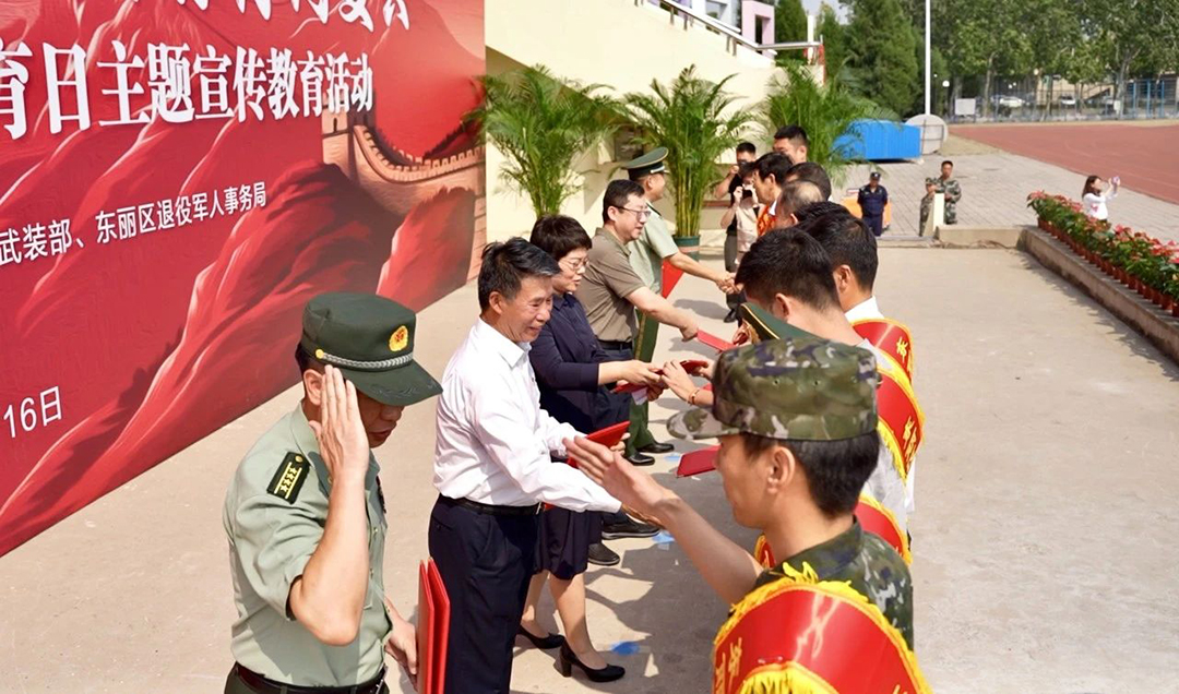 活动中,在场领导为区退役军人事务局老兵宣讲团、区“强军理论优秀教员”、区“最美拥军人物”、“最美退役军人”代表组成的东丽区全民国防教育宣讲团颁发聘书。中国民航大学学生代表、典型模范代表、新立街道、退役军人事务局相关负责人做了表态发言。