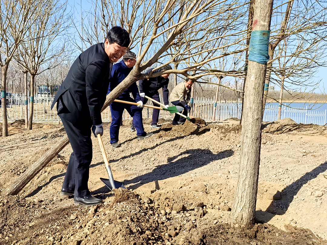 东湖风景区位于绿色生态屏障区内,风景区内湖面荡漾,林水相依,草长莺飞,成为市民游憩休闲、亲近自然的好去处。赵飞、贾堤、李春、李大勇、刘伟、崔洪金等来到这里,拿起铁锹来到植树区域,挥锹铲土、培土围堰、提桶浇水,种下北京栾、旱柳等苗木。新种下的树木迎风挺立,一排排矗立在岸边,枝条在春风的吹拂下轻轻摇曳,充满勃勃生机。