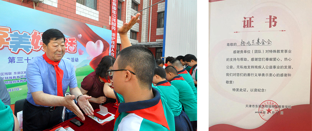 表彰会议在雄壮的国歌声后隆重开始,少先队员代表为各位参会领导、来宾敬献红领巾,孩子们用特殊的方式表达了对各位领导和来宾的尊敬爱戴与热情欢迎。接着,吴会新校长代表学校致感谢词,向一直以来关心、支持学校发展的企事业单位和社会爱心人士表达了诚挚的谢意。“扶残助困,善举济世,关爱生命,回报社会,推动天津市慈善事业发展”是天津市杨兆兰慈善基金会发展的宗旨,自基金会成立以来,已向东丽区民强特教学校捐款100余万元,用于支持本区特殊教育事业。在本次活动的颁奖环节,民强学校吴会新校长特别向荣耀体育(中国)集团代表颁发证书,以示杨兆兰慈善基金会多年来对特殊教育事业的支持与感谢。
