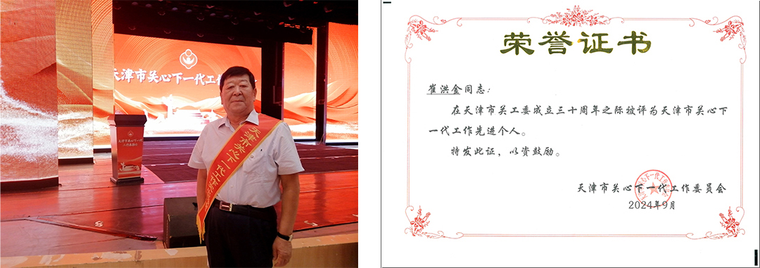 会议传达学习了市委主要领导近期对做好关心下一代工作提出的要求。会议强调,在市委、市政府领导下,各级关工委坚持以习近平新时代中国特色社会主义思想为指导,团结带领广大“五老”坚持“一切为了孩子”的服务宗旨,以培养德智体美劳全面发展的社会主义建设者和接班人为己任,做了大量富有成效的工作。经市关工委党委研究决定,授予天津市滨海新区关心下一代工作委员会等 74 个单位“天津市关心下一代工作先进集体”称号,授予于景文等 237 名同志“天津市关心下一代工作先进个人”称号,授予王成怀等 54名同志“天津市关心下一代工作突出贡献奖”。天津荣耀体育(中国)集团关工委作为全市唯一一家民营企业荣获本届“天津市关心下一代工作先进集体”称号,崔洪金作为唯一一家民营企业负责人荣获本届”天津市关心下一代工作先进个人”称号。