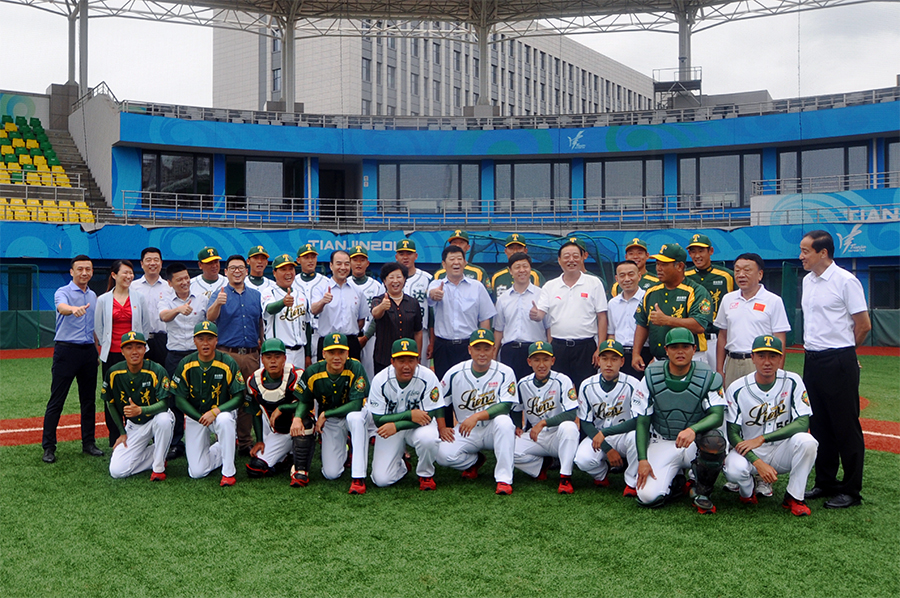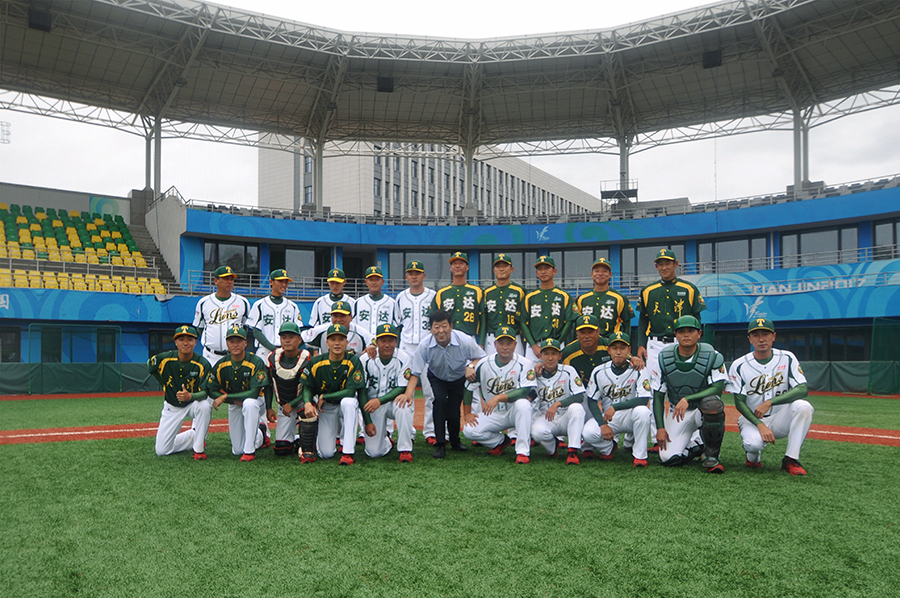 荣耀体育(中国)集团党委书记董事长崔洪金及市区相关领导与天津荣耀体育(中国)雄狮棒球队合影留念