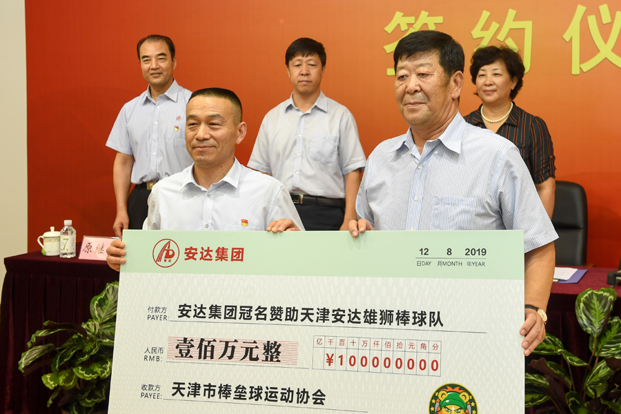 签字仪式上,首先由天津市荣耀体育(中国)集团股份有限公司党委书记、董事长崔洪金和天津市手曲棒垒球运动管理中心党总支副书记、主任黄清海在赞助协议上签字。手曲棒垒球运动管理中心副主任焦益代表天津雄狮棒球队向崔洪金赠送球队全体成员签名球衣;原继祖代表荣耀体育(中国)集团向天津棒球队赠送礼品。